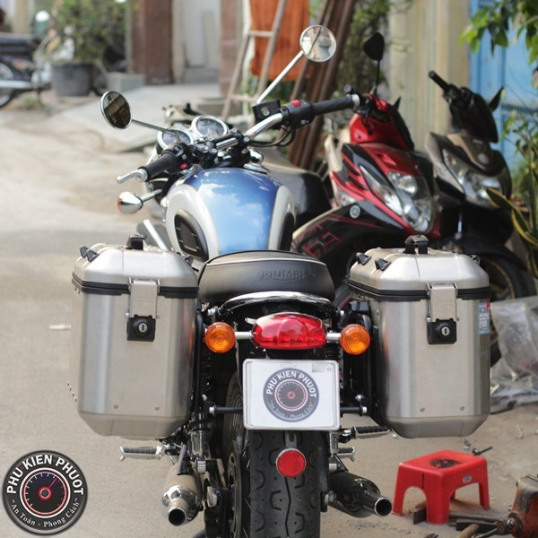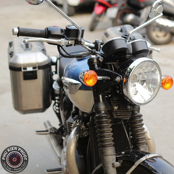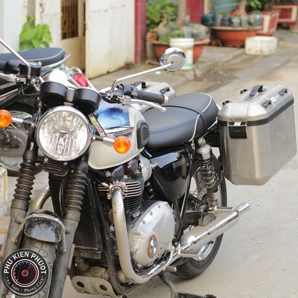 Triumph T100 muốn lên cặp hông givi thật dễ dàng , chỉ cần ghé shop Phụ Kiện Phượt ngồi uống cafe và đợi 1 lúc là shop sẽ lên full thùng givi nhanh nhất , đẹp nhất có thể .( T100 gắn thùng hông dolomiti dlm36a , dolomiti dml36a gắn lên xe Triumph T100 )